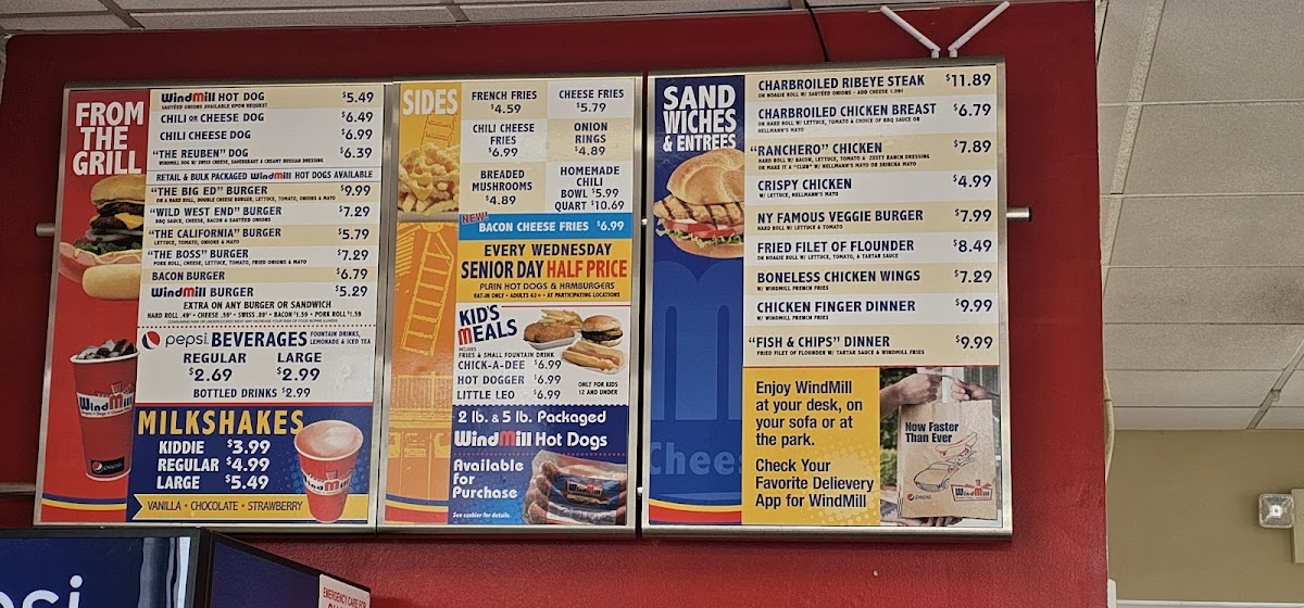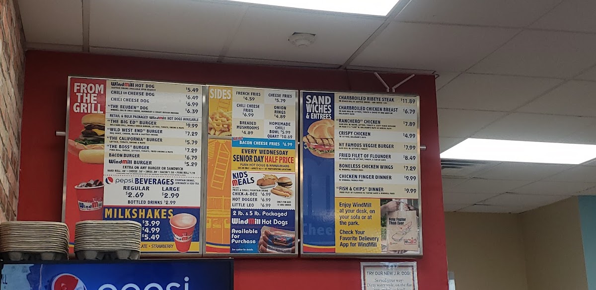 For those craving hot dogs, the WindMill Hot Dogs selection is sure to please. Options like the Chili Cheese Dog, the classic Hot Dog, and the customizable Do-It-Yourself BBQ Cheese Dog are perfect for those who love a savory bite with a bit of flair. If you're in the mood for something heartier, the Dinners section offers Chicken Finger Dinner and Boneless Chicken Wings Dinner, which are perfect for a satisfying, no-fuss meal.